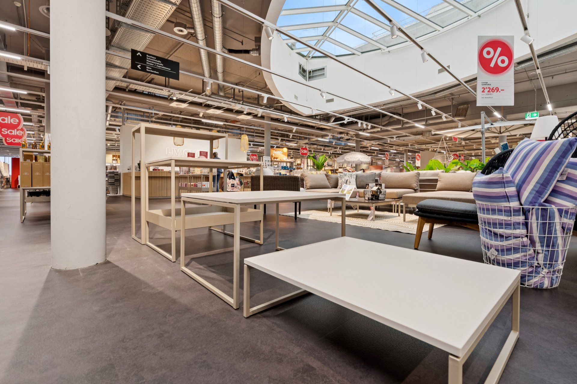 Festlegung der Grössen – Klärung der Designaspekte: Die Tische sollten leicht und fein wirken, aber robust genug sein, um auch schwere Produkte zu tragen – Erstellung von Skizzen und Visualisierungen – Lösung: Gestell aus pulverbeschichtetem Stahl, Platten aus beschichteten Spanplatten — hochwertige Optik durch Schattenfugen.